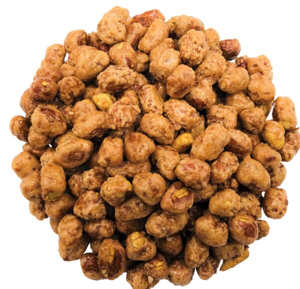Ausgewählte Erdnüsse per Hand karamellisiert. Unter einer rötlich-braunen Zuckerkruste verstecken sich die beliebten Nüsschen, die sich hervorragend als süßer Snack für Zwischendurch eignen.