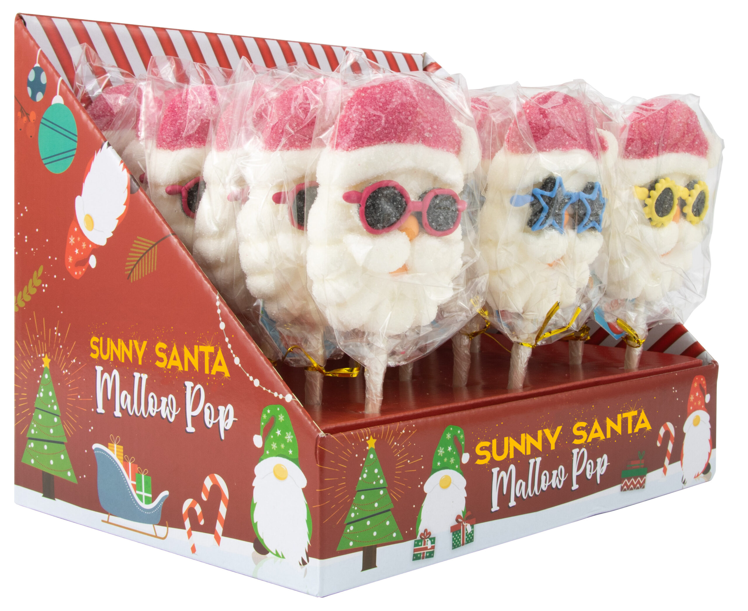 Dieser süße Hingucker bringt Sonne in die Winterzeit! Der Marshmallow Pop Sunny Santa ist ein fluffiger Marshmallow-Lolly mit 45 g, liebevoll gestaltet als fröhlicher Weihnachtsmann mit stylischer Sonnenbrille.